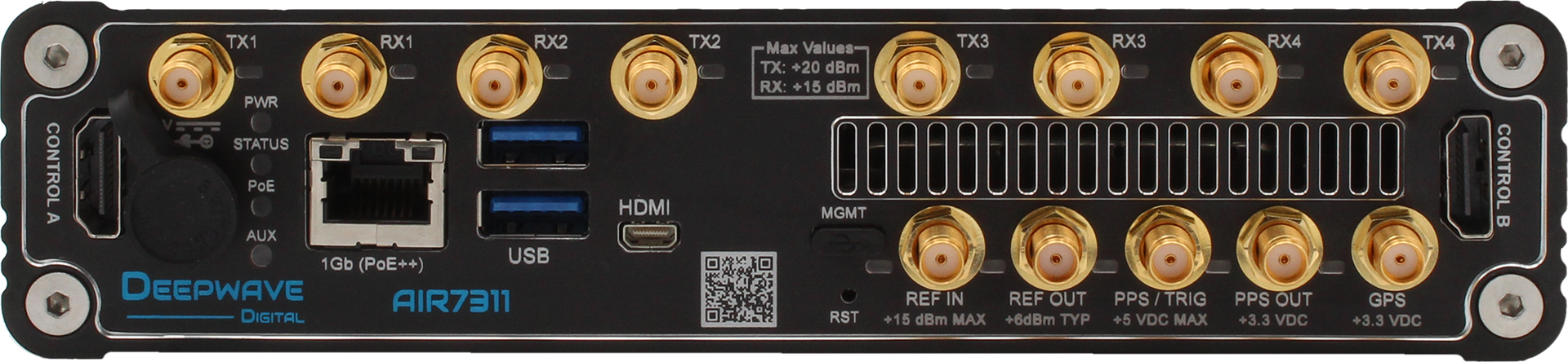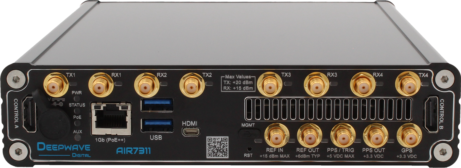 The AIR-T comes pre-loaded with a full software stack, AirStack. AirStack includes all the components necessary to utilize the AIR-T, such as an Ubuntu based operating system, AIR-T specific device drivers, and the FPGA firmware. The operating system is based off of NVIDIA JetPack SDK and is upgraded regularly. Please check for the latest software at www.deepwave.ai.