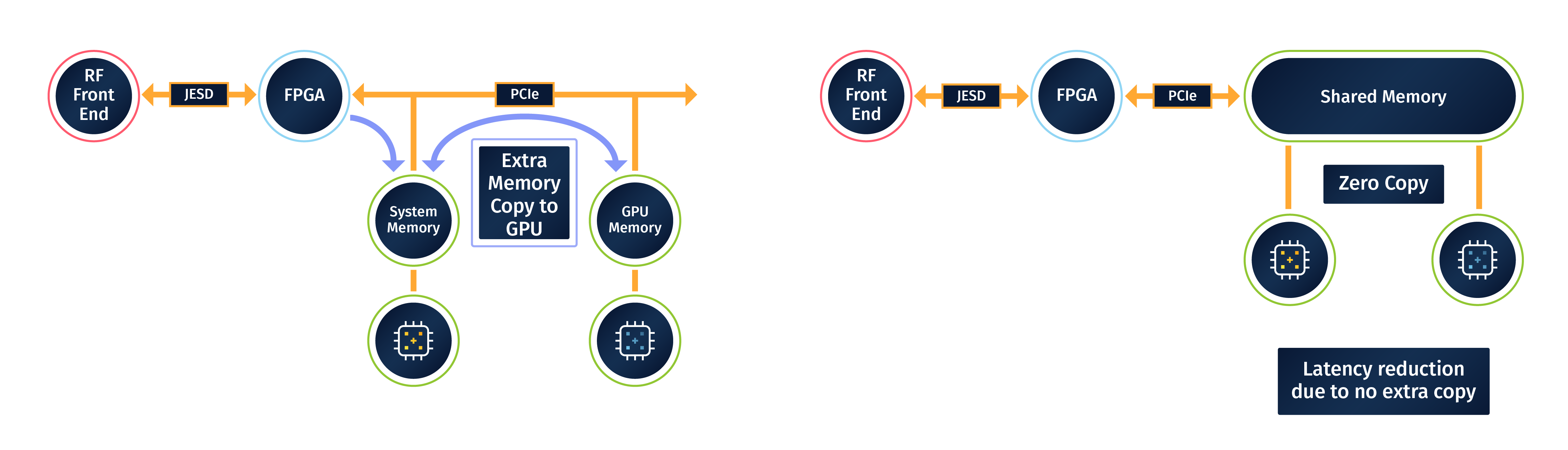 The AIR7311-B Embedded Series AIR-T uses the NVIDIA Jetson Orin NX System On Module (SOM) as its General Purpose Processor (GPP). The Jetson Orin NX SOM contains an ARM Cortex A78AE 64-bit processor (8 cores), an NVIDIA Ampere GPU (1024 cores), and 16 GBytes of memory. The CPUs and GPU all share a common pool of memory, which (along with a unified memory architecture) allows for a zero-copy capability. As illustrated in the figure below, zero-copy eliminates the host-to-device (or device-to-host) memory transfer that is required by SDRs with discrete GPUs, such as an SDR connected to an external laptop or computer. Because of this, an SDR with a discrete GPU will have increased latency that is prohibitive for many applications. By utilizing this zero-copy architecture to remove extra data transfers, the AIR-T minimizes latency compared to other SDR architectures.