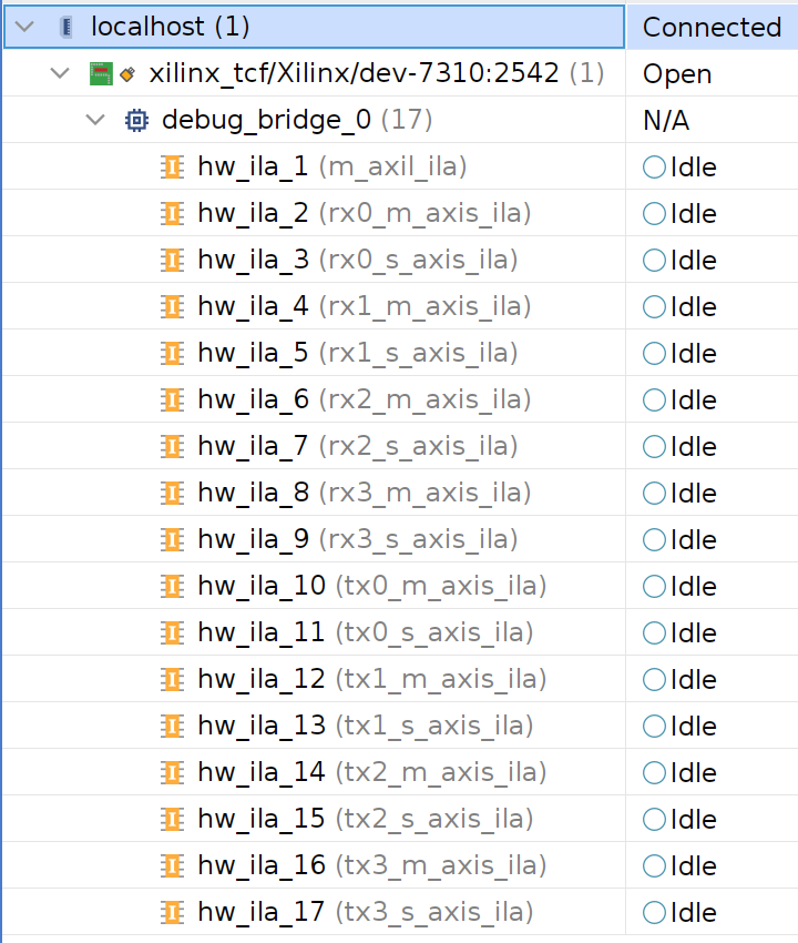 The AirStack BitStream FPGA design comes configured with Chipscope ILAs for the AXI-Lite Control and Status bus and all streaming data AXIS channels. See above Xilinx Virtual Cable section.