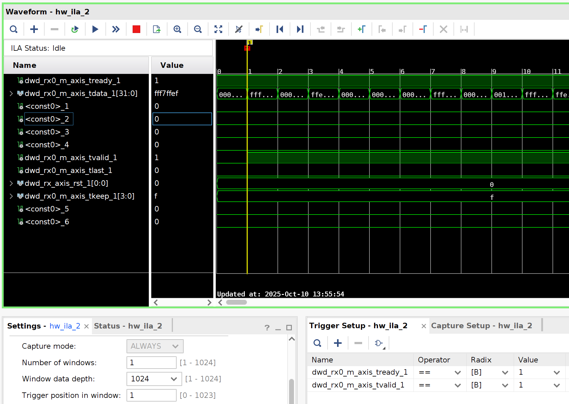 dwd_rx*_m_axis_*- Stream of samples received from the radio. There is very little buffering behind this interface. Constant flow control tready is assumed, deasserting tready drops tdata samples.dwd_rx*_s_axis_*- Stream of samples for software DMA read. Flow control tready is asserted as DMA reads occur.