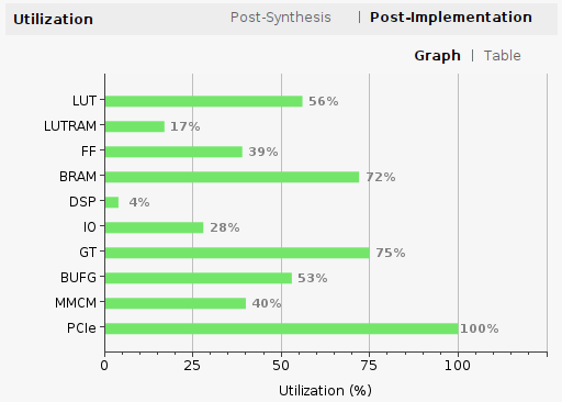 This includes integrated logic analyzer (ILA) instances for every AXI4 bus in the design as well as the default four channel large buffer size configuration of the Deepwave IP core. ILAs can be removed and the amount of resources used by the IP core can be reduced, see below sections.